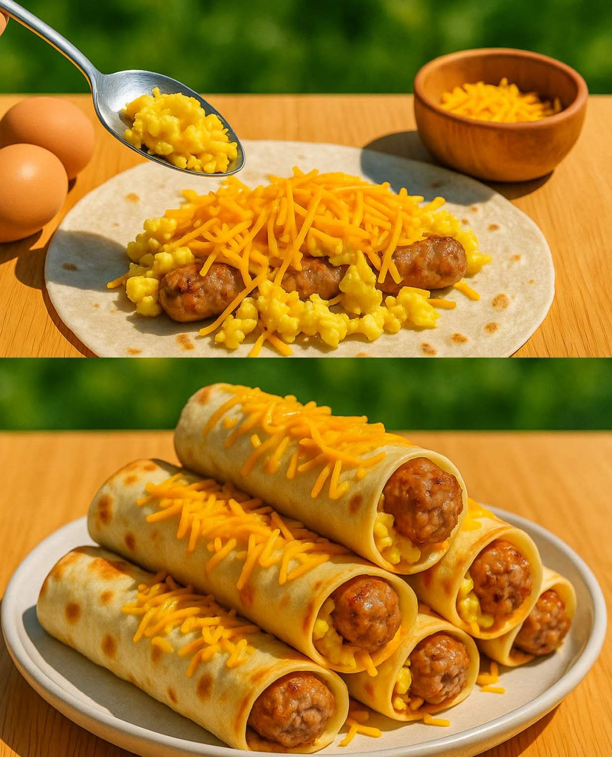 A quick, satisfying breakfast: juicy sausage, fluffy scrambled eggs, and melted cheddar wrapped in warm tortillas β perfect for busy mornings or meal prep.