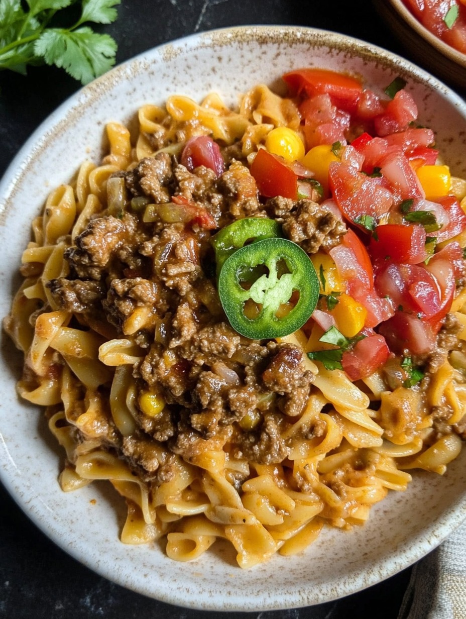 “A comforting and zesty twist on classic pasta night! The taco-seasoned beef mixed with tender noodles and fresh salsa adds a burst of flavor in every bite. Perfect for a weeknight dinner the whole family will love.”
