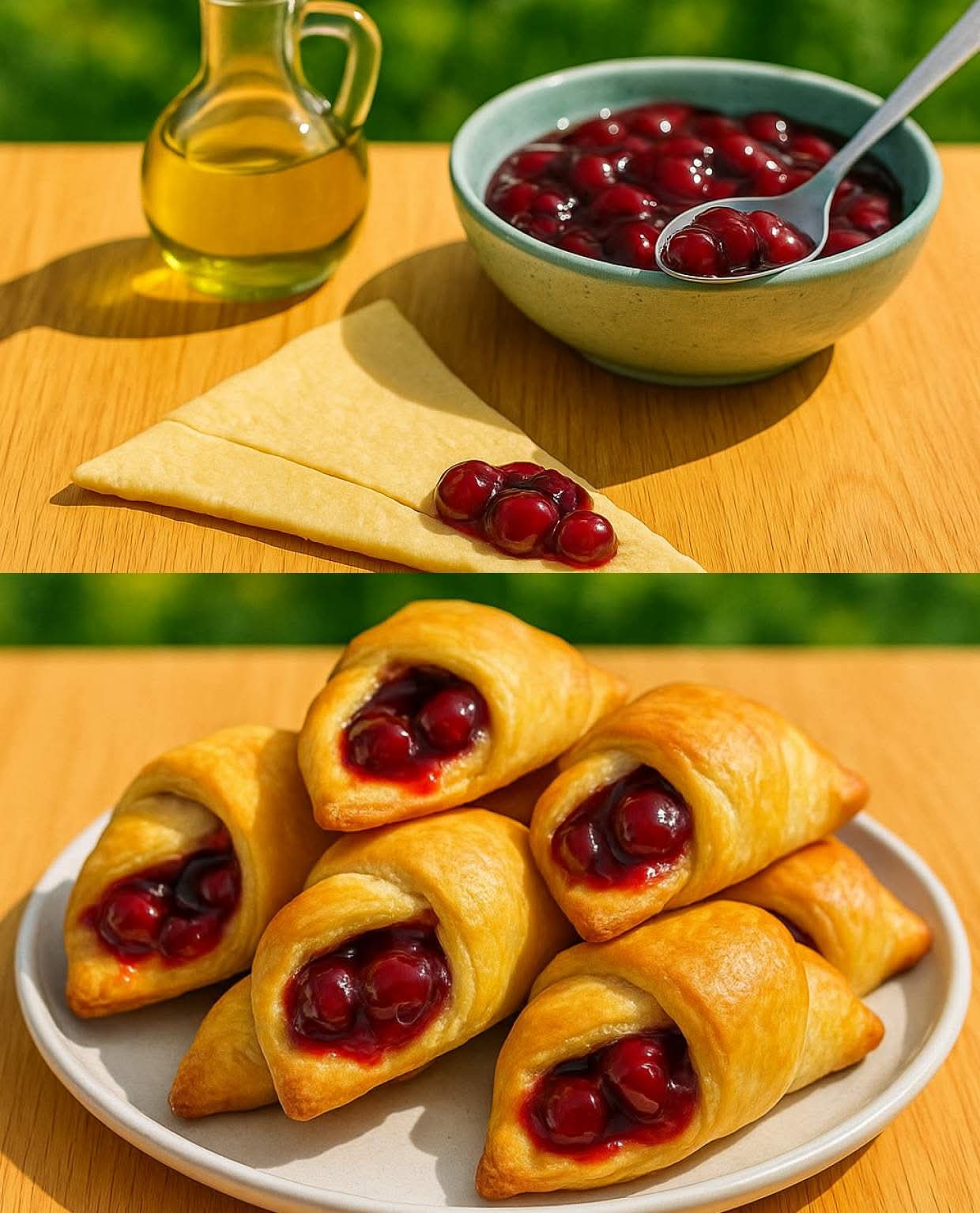 - Place 1 spoon of cherry pie filling at the wide end of each triangle.