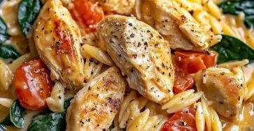 Creamy Chicken Orzo Delight 🍝 Creamy Chicken Orzo Delight 🍗✨ A comforting skillet dish with tender chicken, creamy orzo, fresh…