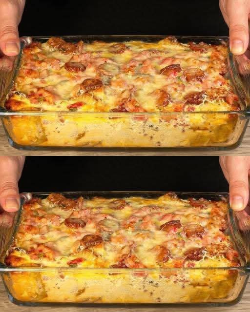 Serve warm with golden cheese top and hearty sausage layers π½οΈ. Ideal for ftour, family breakfasts, or potlucks π.