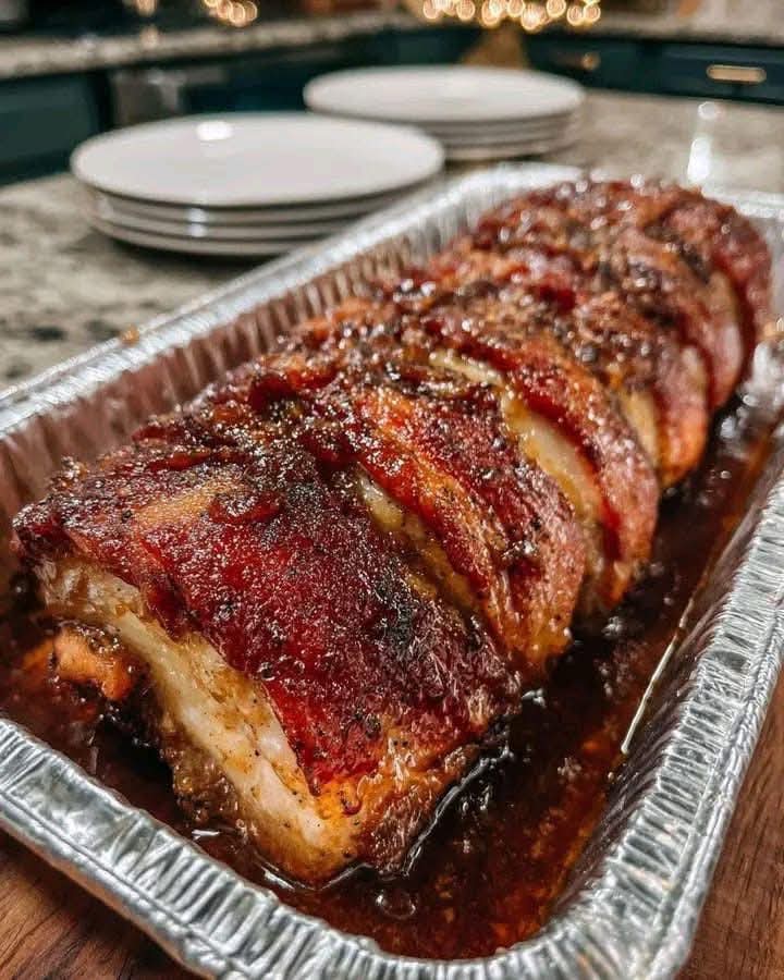✨ Juicy pork, smoky bacon, and sweet caramelized glaze—this dish is a showstopper for any dinner table!