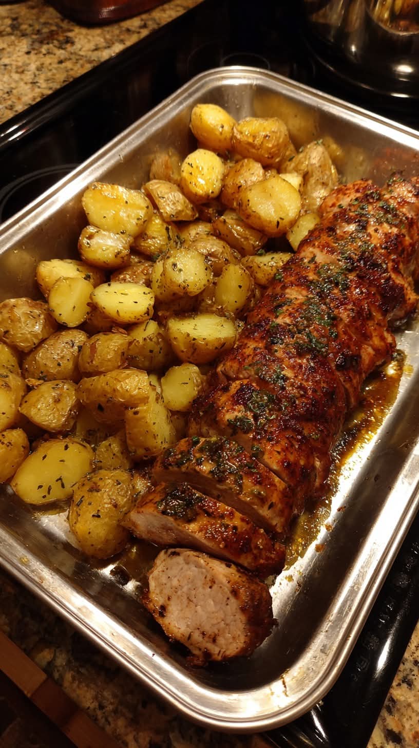 Juicy pork tenderloin rubbed with Cajun spices, roasted alongside crispy golden potatoes for a flavorful feast.