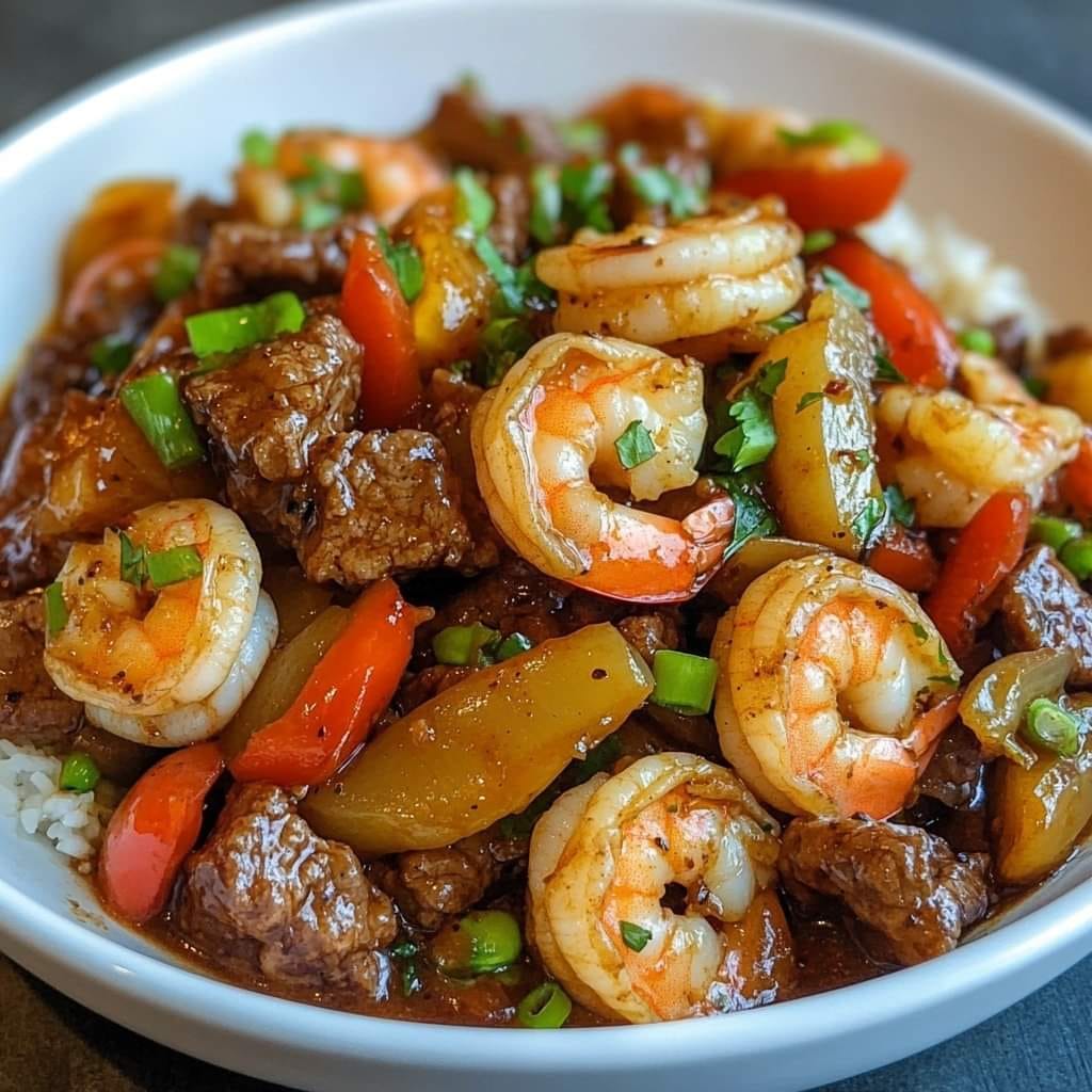 A bold and flavorful stir-fry combining tender beef, juicy shrimp, and Cajun spices for a quick, hearty meal.