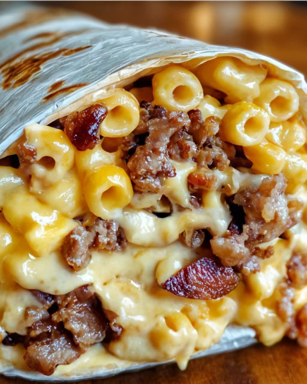 Caption: “Cheesy Burger Wrap with Crispy Beef & Macaroni—golden, melty comfort in every bite 🥩🍝🧀✨”