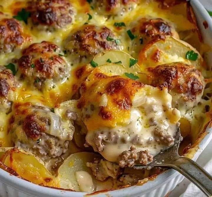 Rich, cheesy, and layered with flavor—this meatball bake is pure comfort in every bite 🥔🧀🍖.