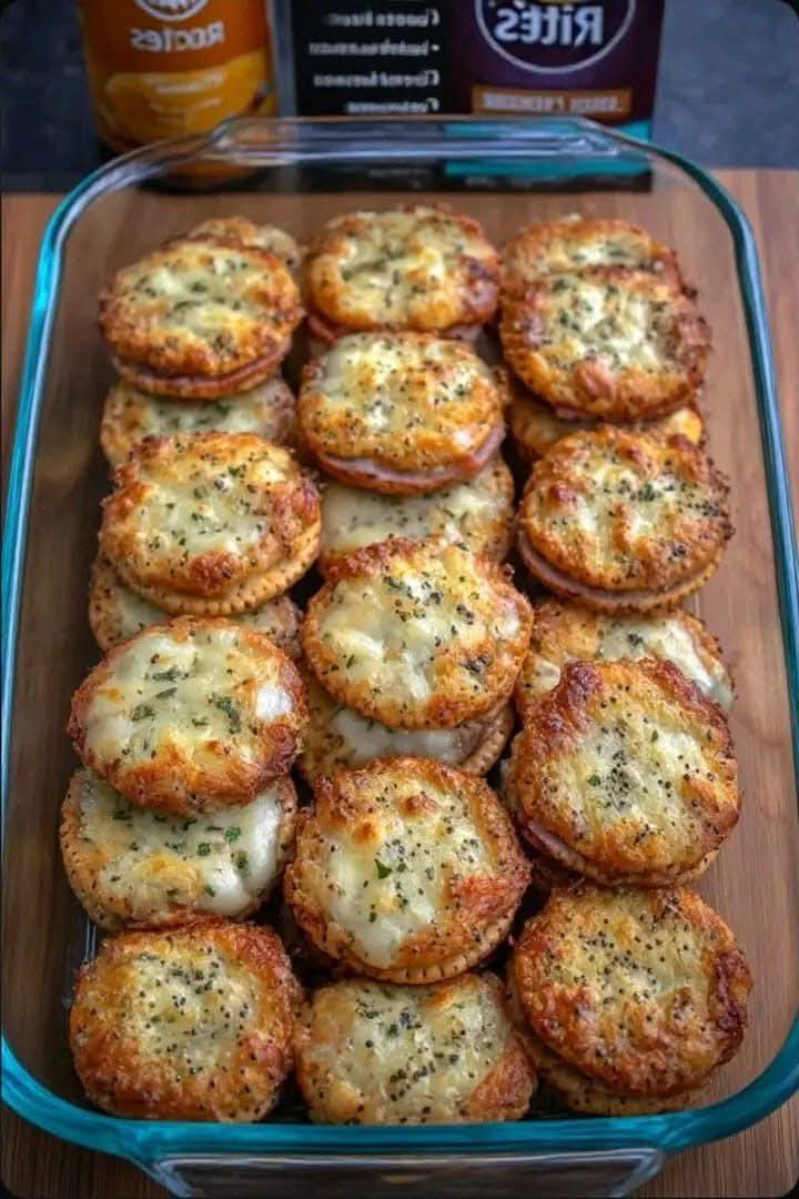 Golden Ritz cracker sandwiches filled with savory deli meat, topped with melted cheese and herbs—easy, crispy, and crowd-pleasing!