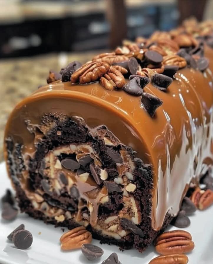 A decadent chocolate sponge rolled with caramel cream, pecans, and chocolate chips, finished with a glossy caramel glaze.