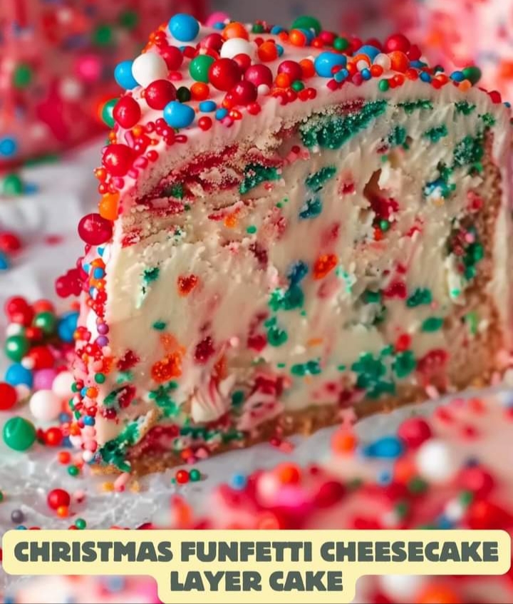 This Christmas Funfetti Cheesecake Layer Cake ππ° is the ultimate festive showstopper! With layers of fluffy funfetti cake, creamy cheesecake, and red & green frosting, it’s perfect for holiday gatherings ππ .