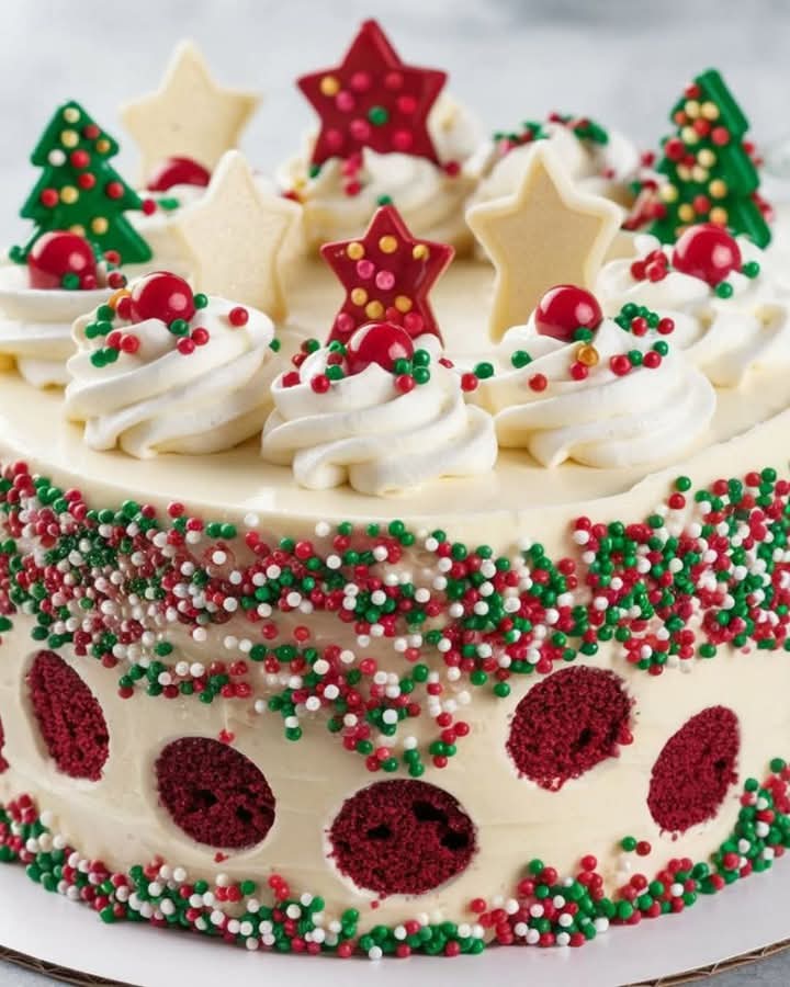This indulgent holiday cake combines rich red velvet, creamy white chocolate, and a fluffy cream cheese topping—perfect for festive gatherings!