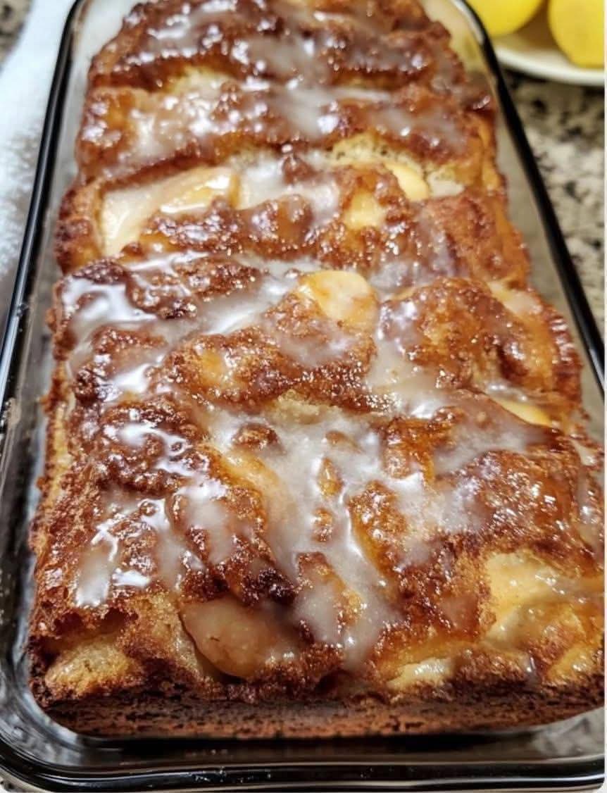 Caption: “Cinnamon Swirl Apple Fritter Bread—sweet apples, warm spice, and a drizzle of glaze! 🍎🍞✨”