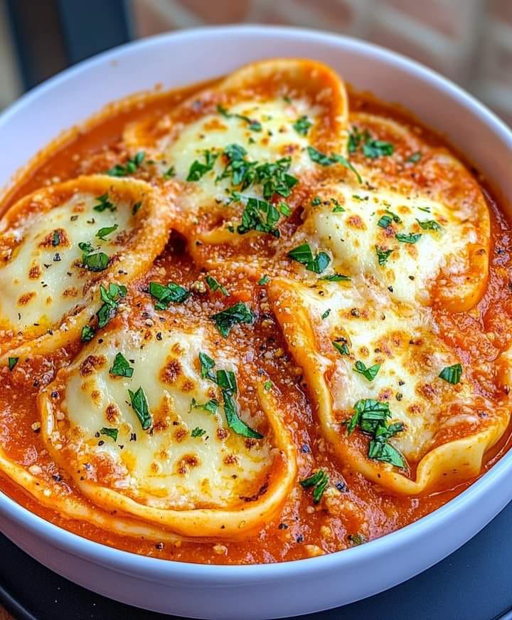 🍲 Slow Cooker Tomato Tortellini Soup with Cheddar Toast Bites 🍞🧀
