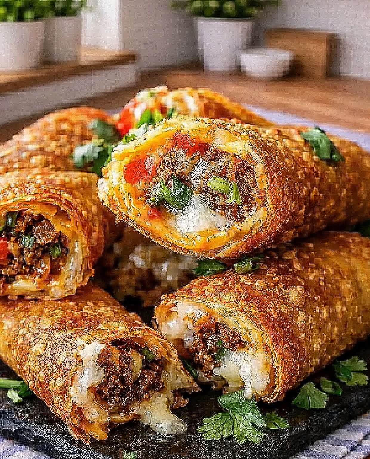 Golden egg rolls that are crunchy on the outside and filled with savory beef, gooey cheese, and veggies inside. Perfect for parties, snacks, or cozy evenings.