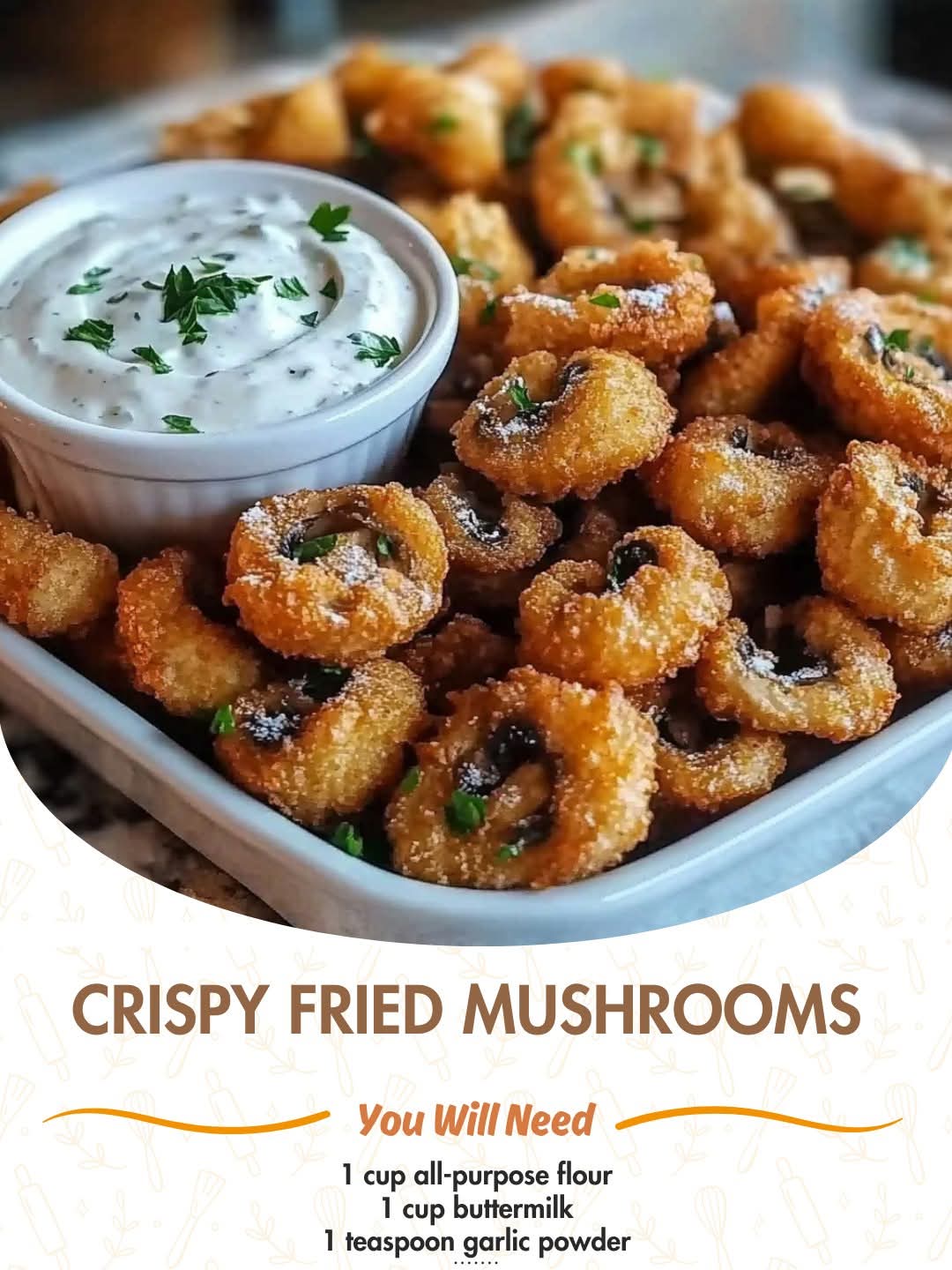 Golden, crunchy mushrooms paired with a creamy ranch dip—an irresistible appetizer or snack!