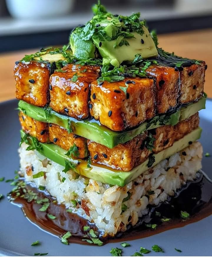 🥑 Crispy Teriyaki Tofu and Avocado Rice Stack 🍚✨