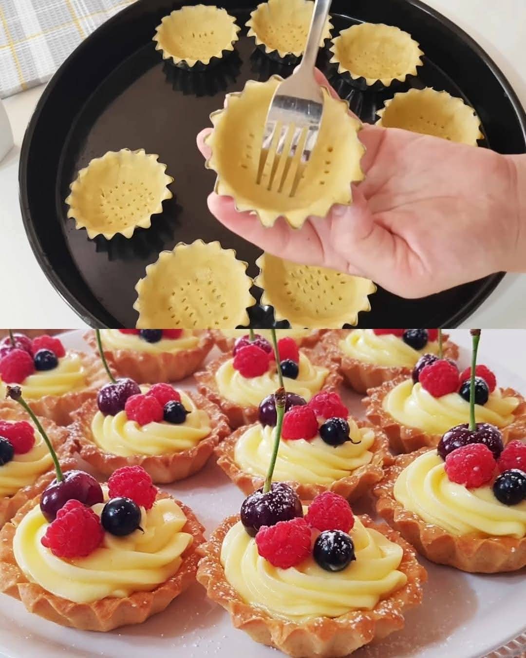 - Bake shells: Roll dough, cut circles, and press into mini tart pans. Prick with fork. Bake at 350°F (175°C) for 12–15 minutes until golden. Cool completely.