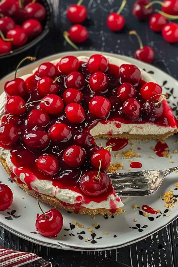 ✨ A creamy, dreamy cheesecake topped with cherries—perfect for indulgence without turning on the oven!