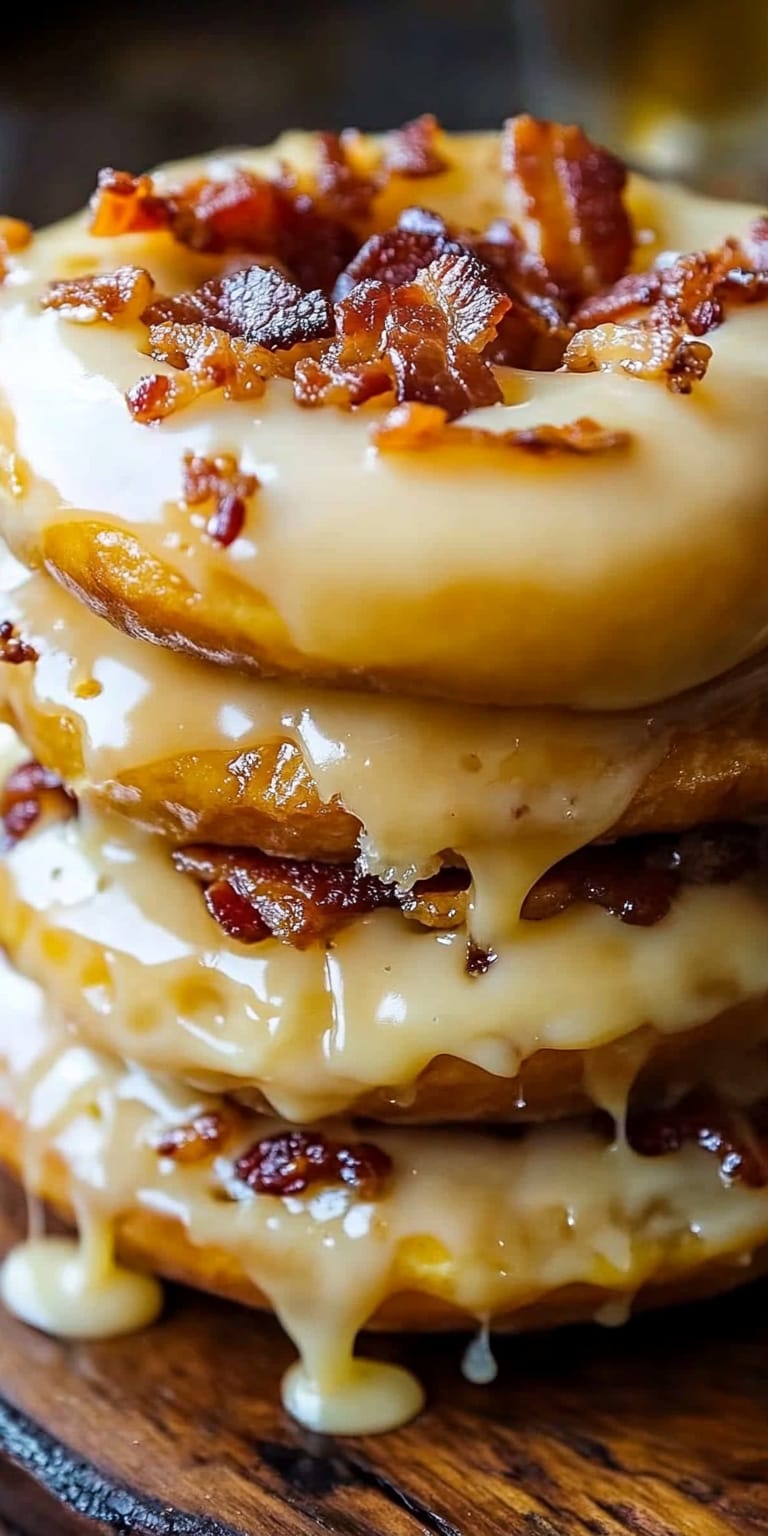 A sweet and savory twist—gooey grilled cheese sandwiched in glazed donuts, topped with crispy bacon and maple glaze.