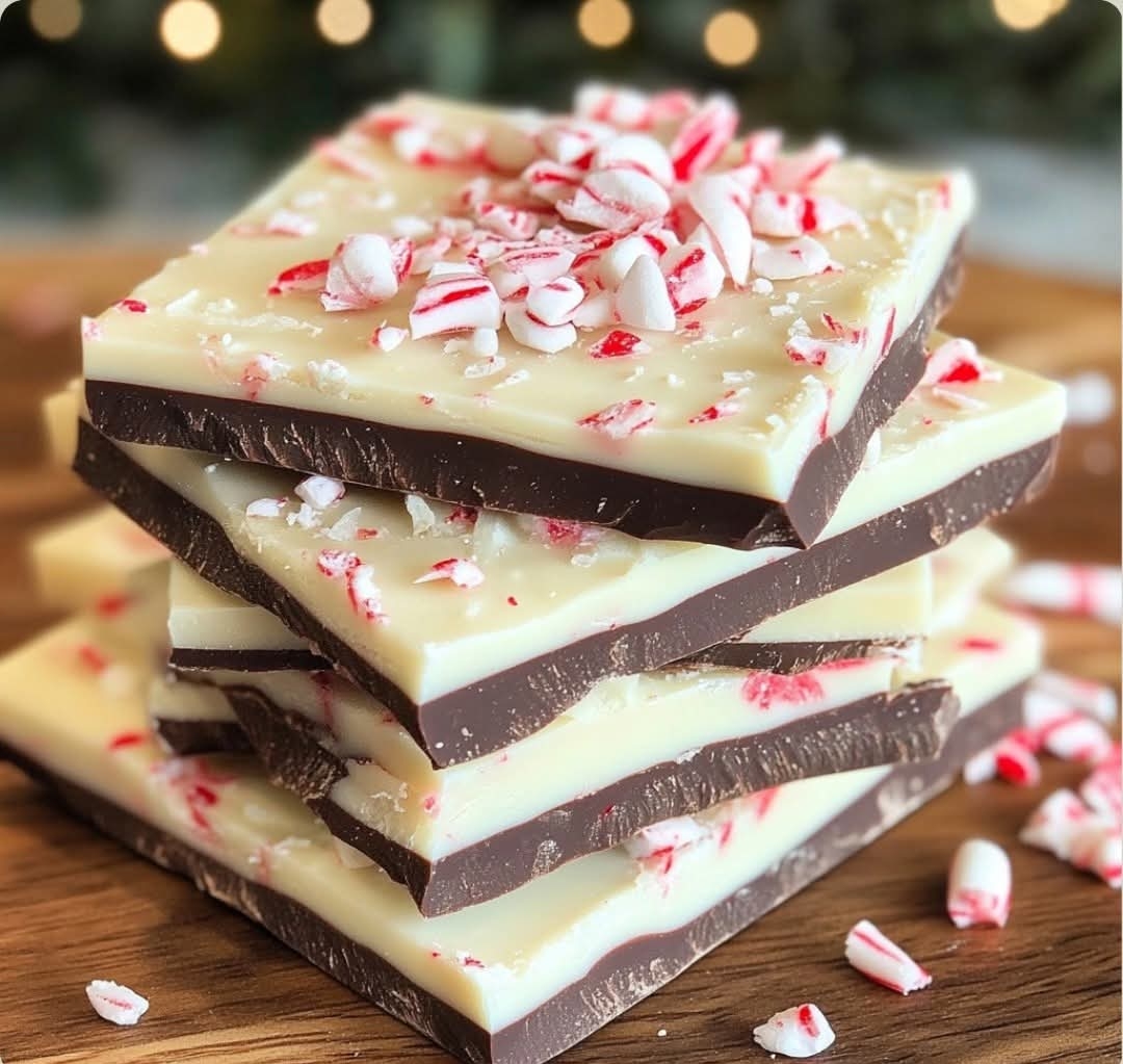Caption: “Easy Peppermint Bark—festive crunch, chocolate layers, and holiday cheer in every bite! 🎄🍫✨”