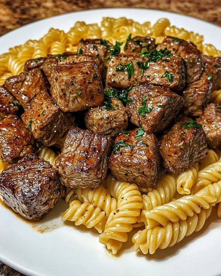 Juicy seared beef cubes over tender rotini pasta, tossed in a savory garlic butter sauce and fresh herbs.