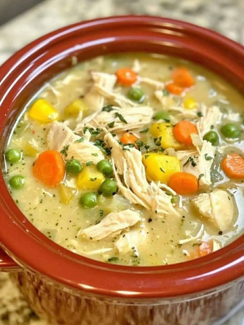 Stews and one-pot meals are ancient — every culture has a version. Chicken stews combining poultry with root vegetables are especially common across Europe and North America. The creamy style with a flour or milk binder is a cousin of English-style potages and American comfort-food stews that grew popular in home cooking in the 19th and 20th centuries when dairy and flour were inexpensive ways to add body and calories. This particular combination — shredded chicken, peas, carrots and potatoes in a lightly creamy broth — is a modern, home-kitchen classic rather than a dish tied to a single traditional recipe.