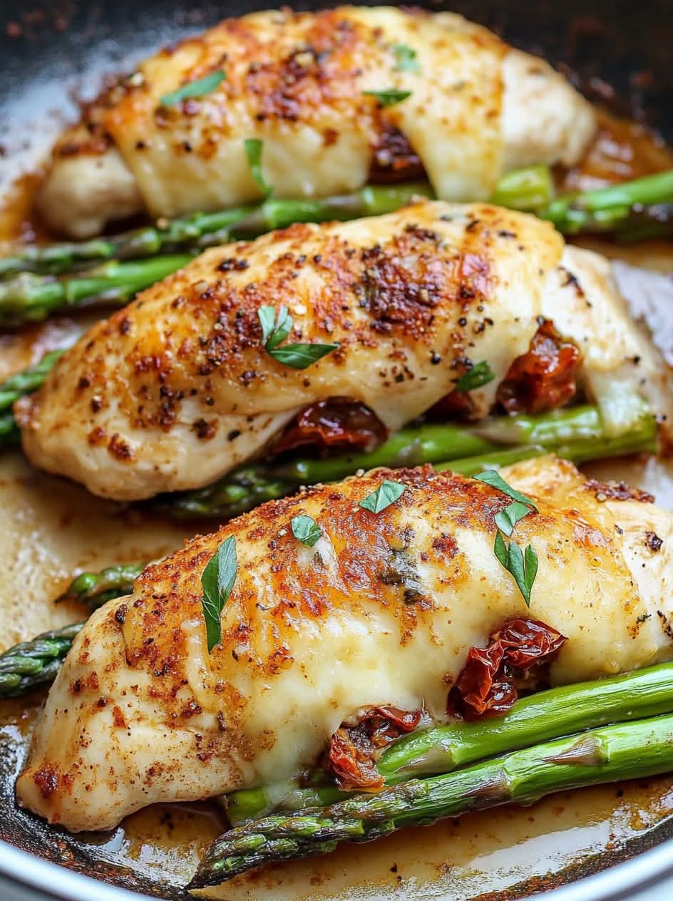 Golden, juicy chicken filled with melty mozzarella, crisp asparagus, and tangy sun-dried tomatoes. A dish that feels gourmet but is easy enough for everyday cooking.