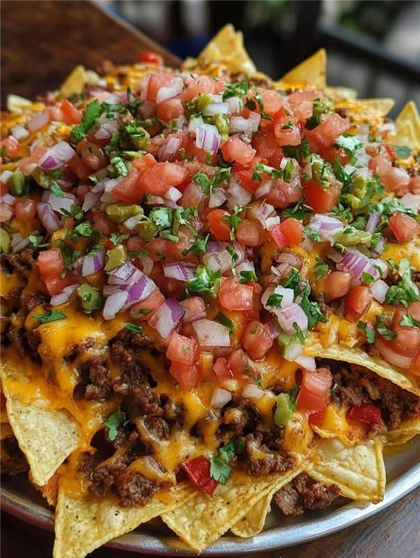 Crunchy tortilla chips layered with savory beef, gooey cheddar, and colorful fresh toppings—perfect for sharing at parties or enjoying as comfort food.