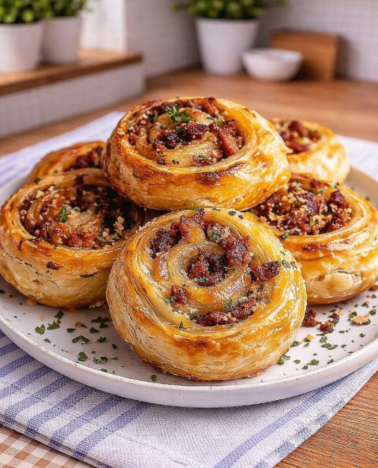 Caption: “Minced Meat Cheese Puff Swirls—flaky, golden, and savory bliss 🥐🥩🧀✨”