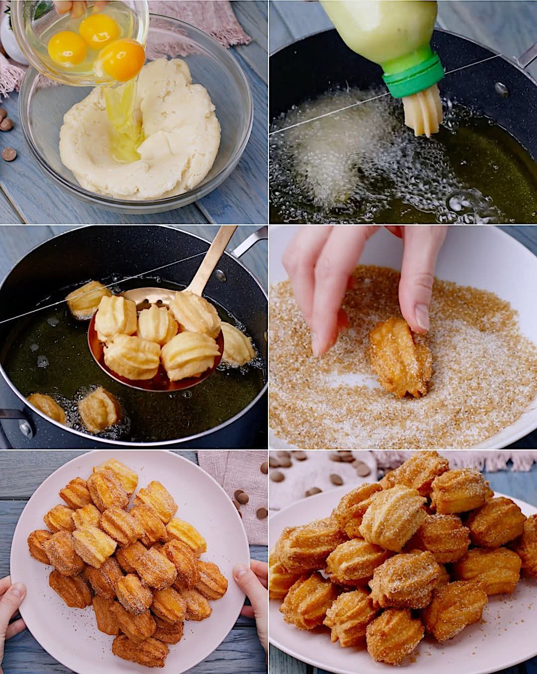 5. πŸ›’οΈ Heat oil in a deep pan. Pipe mini churros directly into hot oil.