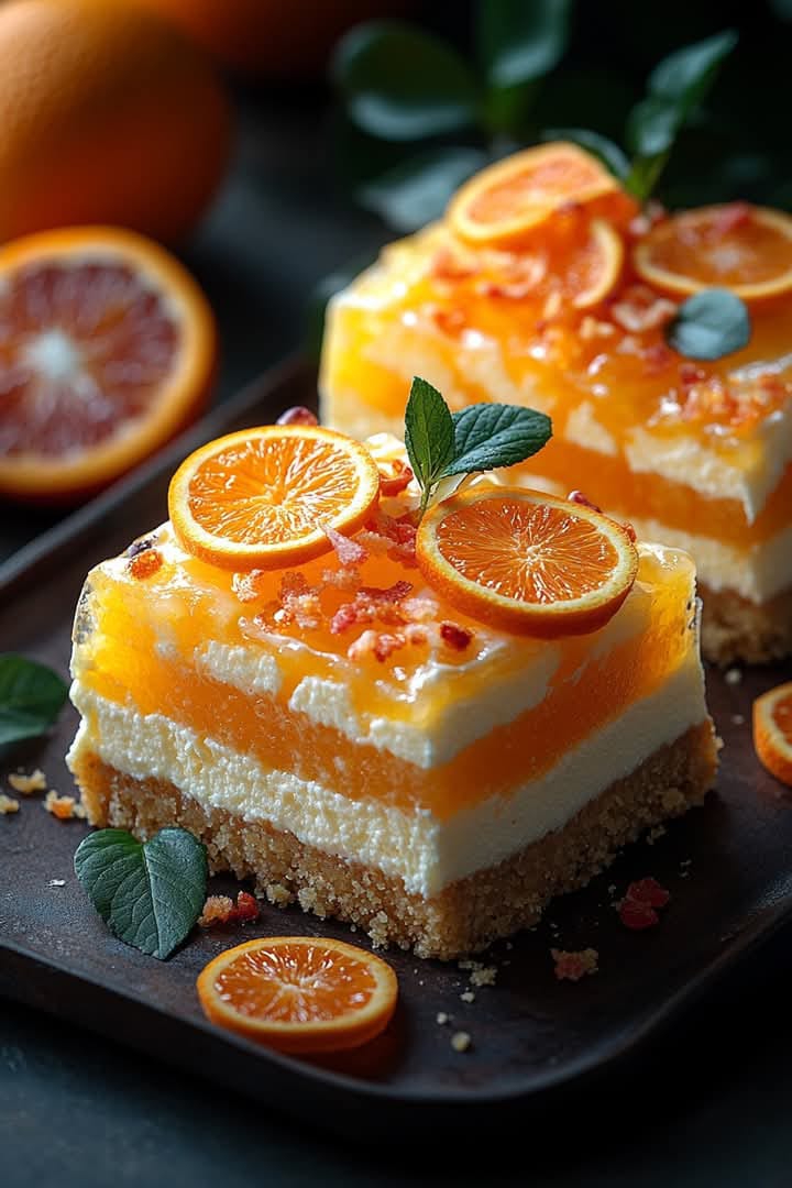 A refreshing layered cheesecake with orange cream, classic cheesecake, and a bright jello topping.