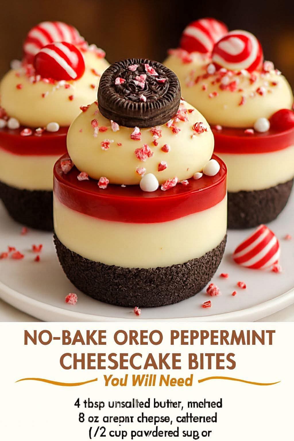 No-Bake Oreo Peppermint Cheesecake Bites are creamy, minty, and irresistibleβ€”a bite of festive indulgence 🍫πŸ₯❄️.