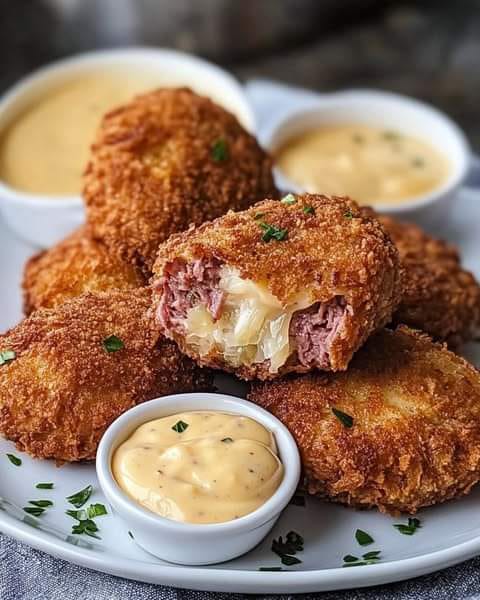 ✨ Crispy, cheesy, tangy, and irresistible—these fritters bring all the flavors of a Reuben sandwich in bite-sized form!