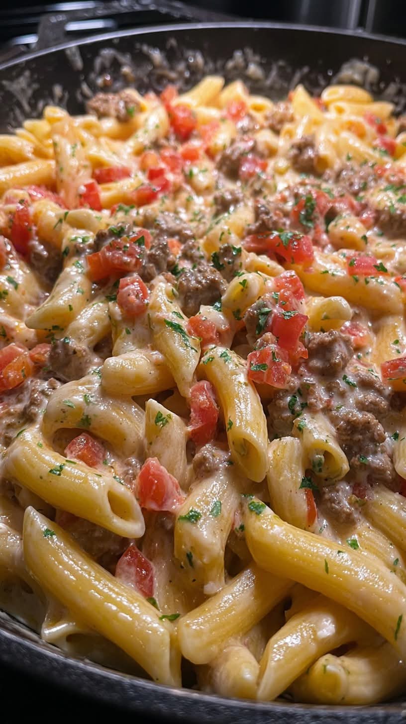 Caption: “Rotel Pasta—creamy, cheesy, and packed with flavor! 🍅🍝✨”
