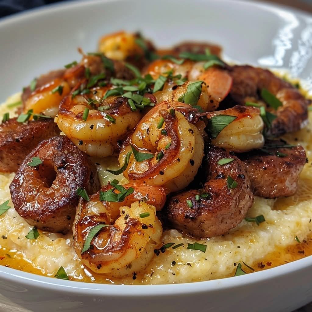 Spoon grits into serving bowls. Top with cooked sausage and shrimp. Garnish with fresh parsley or green onions.