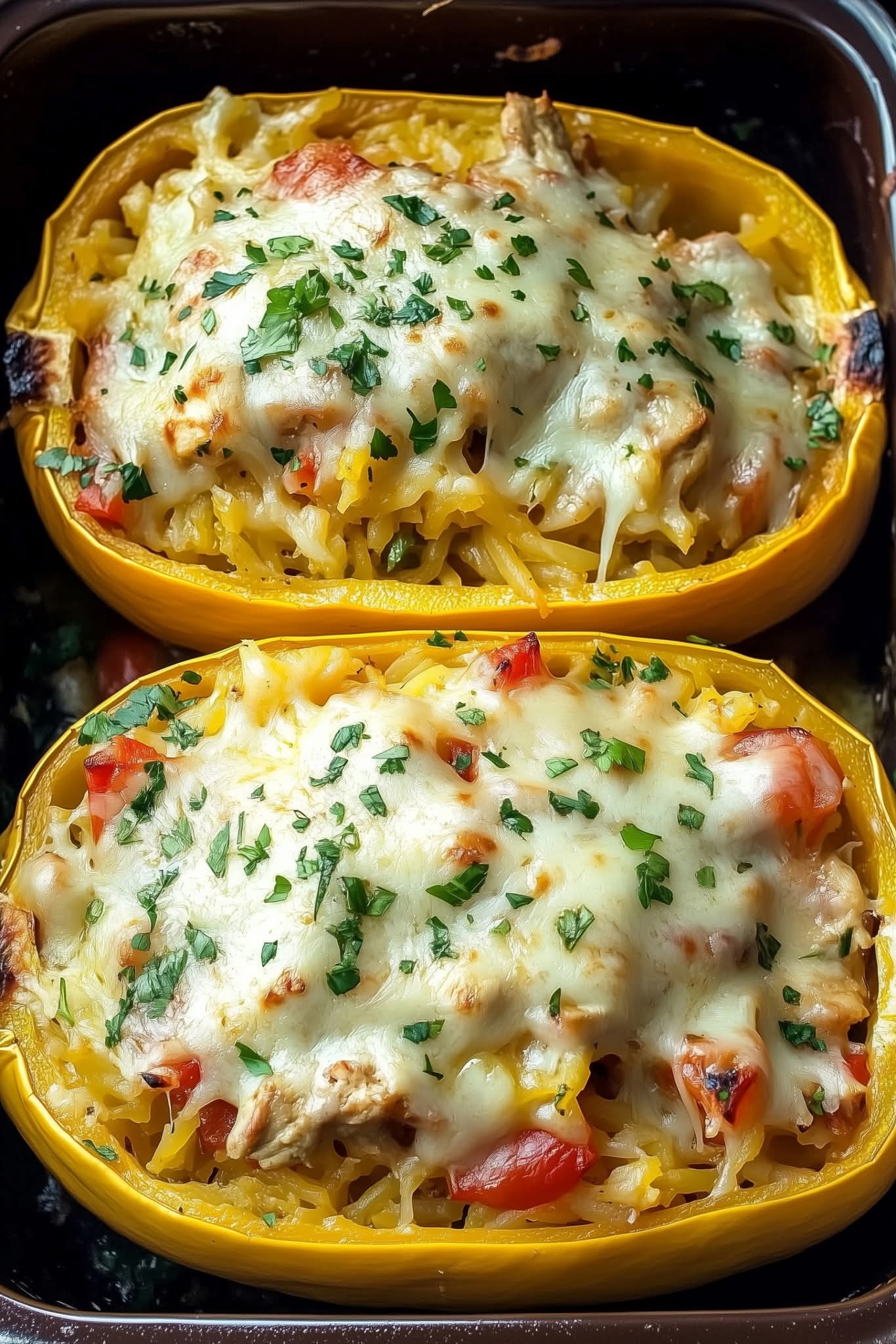 Stuffed Spaghetti Squash Boats are cheesy, nourishing, and satisfyingโ€”a forkful of comfort and health ๐Ÿฅฅ๐Ÿ—๐Ÿง€๐Ÿ”ฅ.