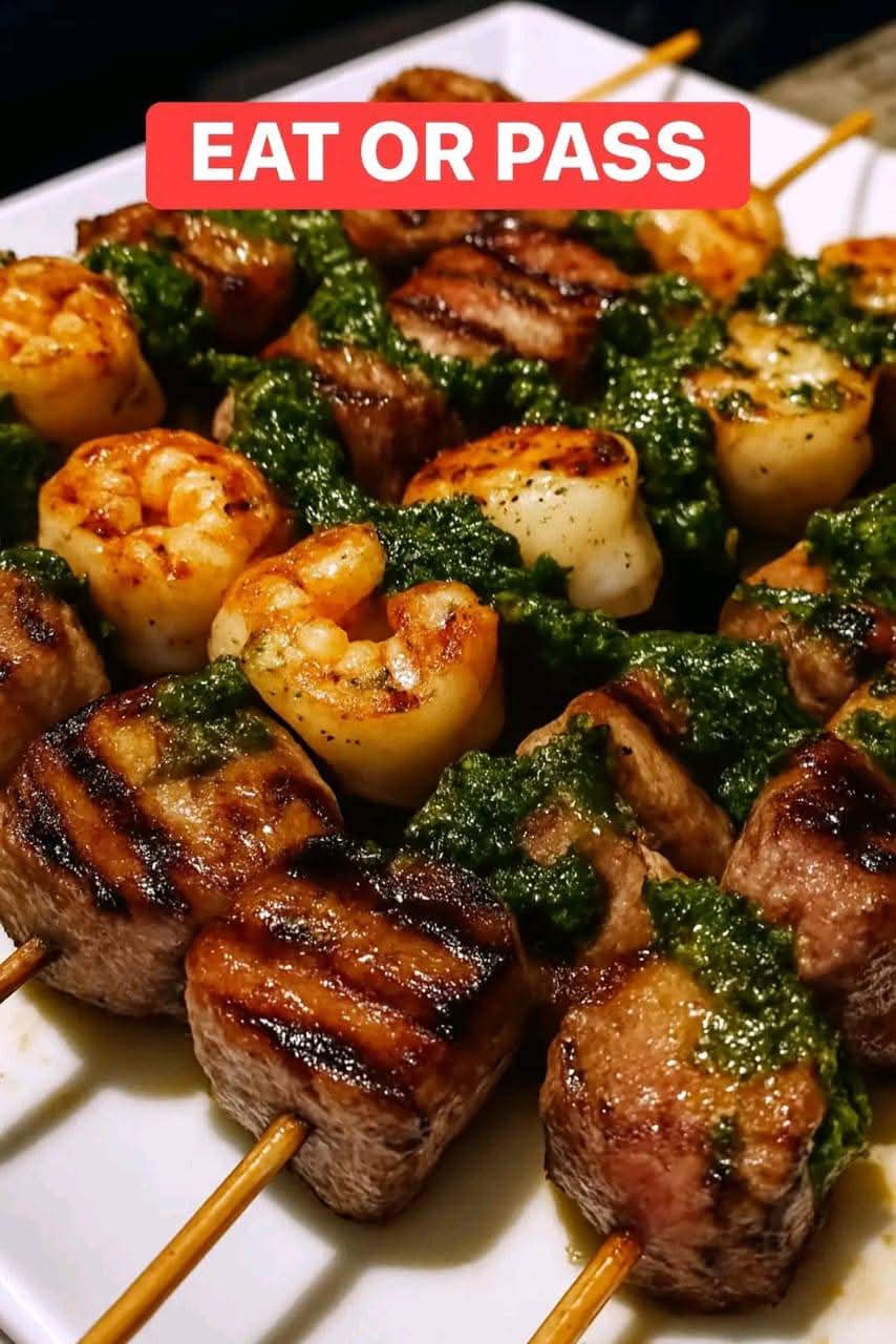 Surf & Turf Skewers with Chimichurri are juicy, bold, and freshβa grilled bite of land and sea harmony π€π₯©πΏ.