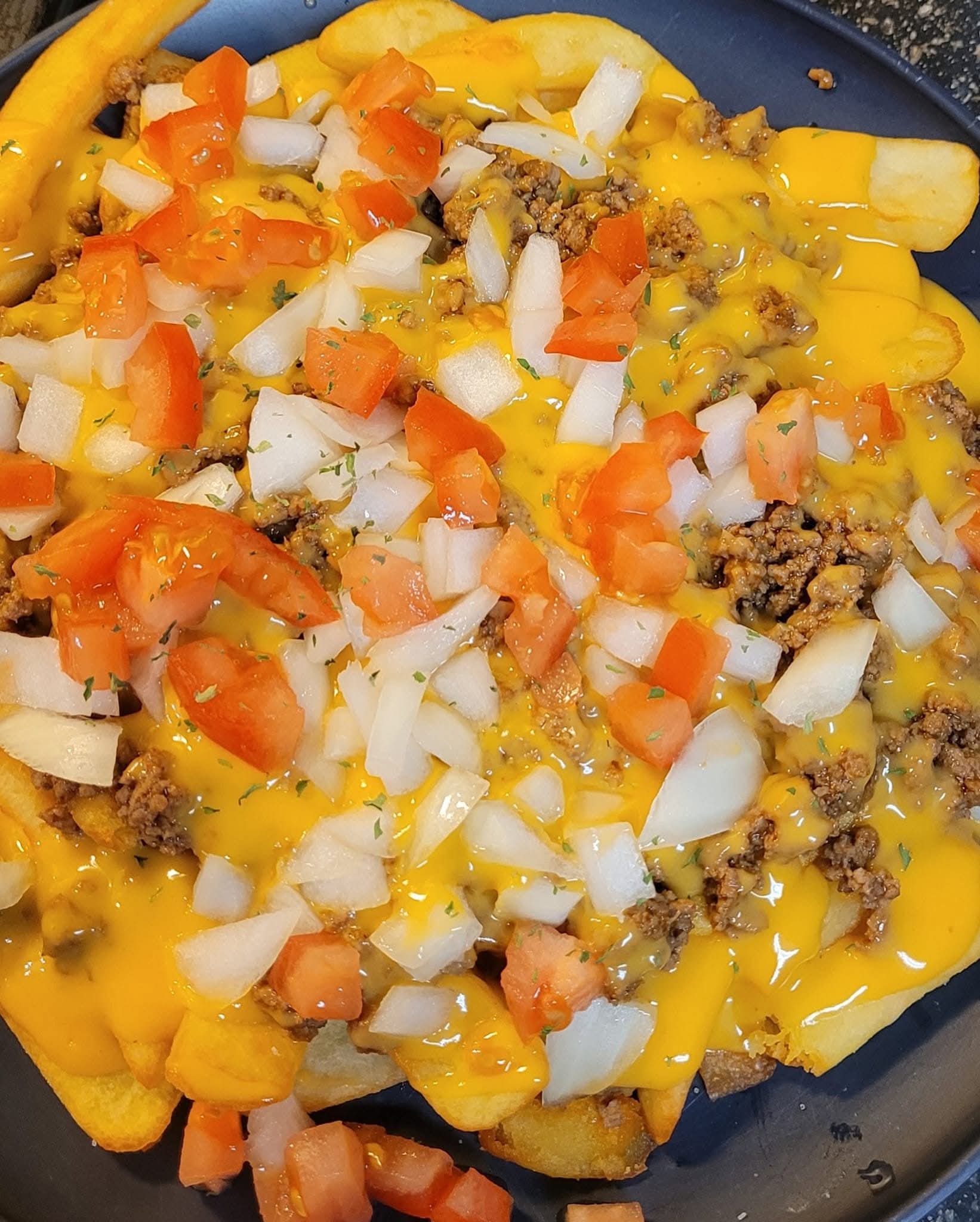 - Assemble: Layer fries on a plate, top with seasoned beef, drizzle with nacho cheese, and garnish with tomato and onion.